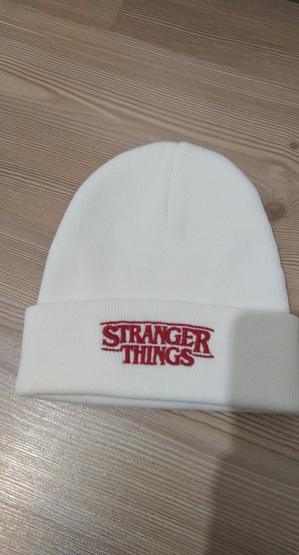 Beyaz örgü kumaştan yapılmış, önünde "Stranger Things" logosu işlenmiş kadın bere. Rahat ve sokak stilini yansıtan tasarım. ❄️