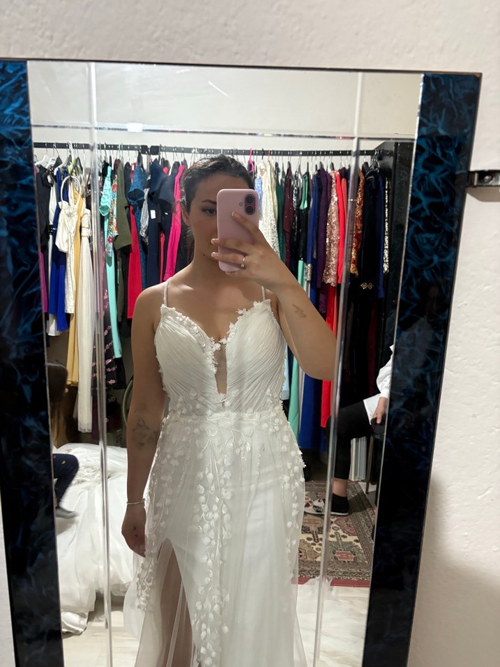 Beyaz, uzun A kesim gelinlik, straplez yaka ve ince askılarla fit kesimdir. Etek kısmında zarif çiçek detayları ve yırtmaç bulunur, bohem tarzı yansıtır. S/M uyumlu