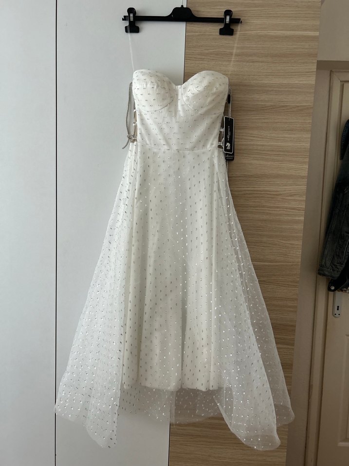 Beyaz renkte, straplez ve A kesim Modern klasik tarzda, vintage esintili, vücuda oturan kesimle şık bir seçim. Dış çekim için almıştım nasip olmadı etiketli 38 beden 36’da giyiyorum bu bana oldu