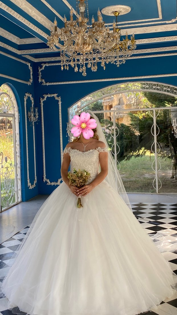 Özel dikim prenses model omuzları düşük ve yukarı da iki türlü de kullanılabiliyor. Arkası ipli olduğu için S-L bedene uyumludur. Ben 56-58 kilo aralığındaydım. boyum 1.69. Tarlatanı ve duvakıyla beraber vericem. duvak yere kadar uzanıyor. Fransız güpürlü. detaylı fotoğraf gönderirim