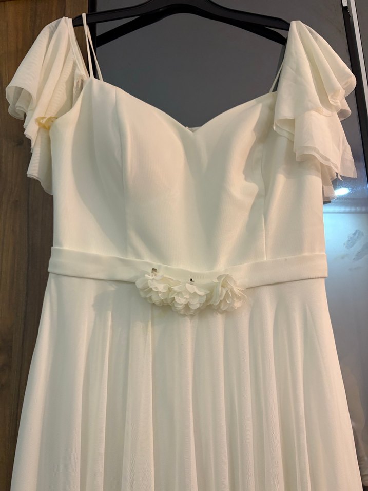 Beyaz renkte, uzun A kesim gelinlik; straplez yaka, ince askılı kollar ve çiçek detaylı beli ile klasik ve modern minimalist tarzı bir arada sunar.
