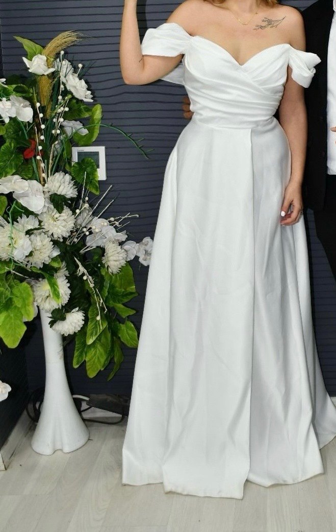 Beyaz, straplez ve A kesim uzun gelinlik, modern klasik tarzda, omuzları açık kollu ve düzenli kesimle minimalist şıklık sunar. 1 kez kullanıldı kuru temizlemeye verilip teslim edilecek.Giyecek olan kişiye de şimdiden mutluluklar Dileyene detaylı fotoğraf atarım iletişime geçmeniz yeterli