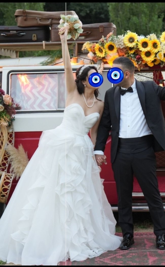 Klasik zarafeti modern dokunuşla birleştiren, straplez yakalı ve ince askılı beyaz A-line uzun gelinlik. Kat kat eteklerle avangart bir görünüm sunar.