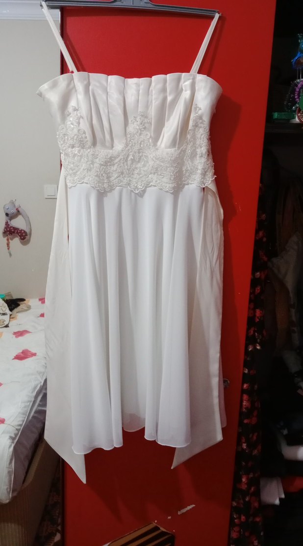 Beyaz straplez, vintage dantel detaylı, askili baby shower klasik şıklık sunar.