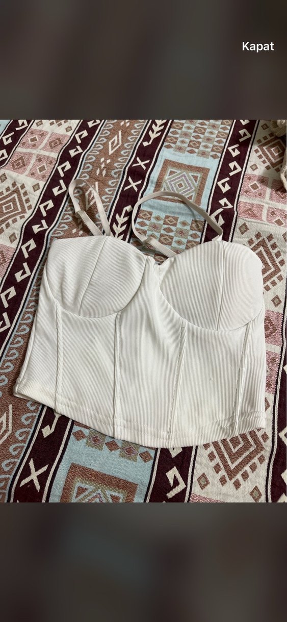 Beyaz renkli, straplez ve ince bantlı, vücuda oturan, midi boyda, yumuşak sentetik kumaştan yapılmış bustiyer. Bohem tarzı için uygun.