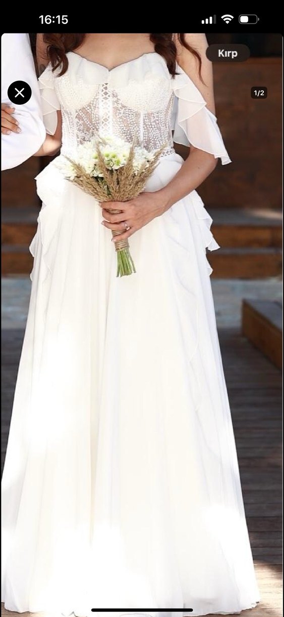 Uzun beyaz A kesim gelinlik, straplez ve ince askılı kollarıyla klasik zarafet ve bohem tarzı bir araya getiriyor. Ürün 42 beden yazsada 38 beden 55 kilo içindir