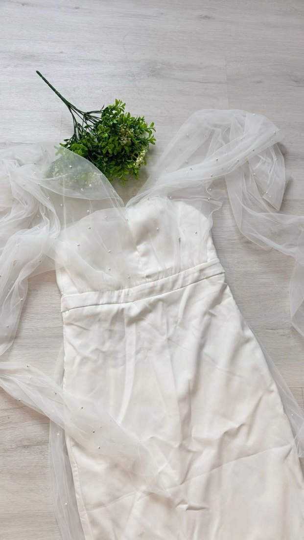Bu beyaz, straplez mini gelinlik, uzun boylu ve bohem tarzda, minimal tasarıma sahip. Kolsuz ve vücuda oturan kesimi ile dikkat çekiyor.