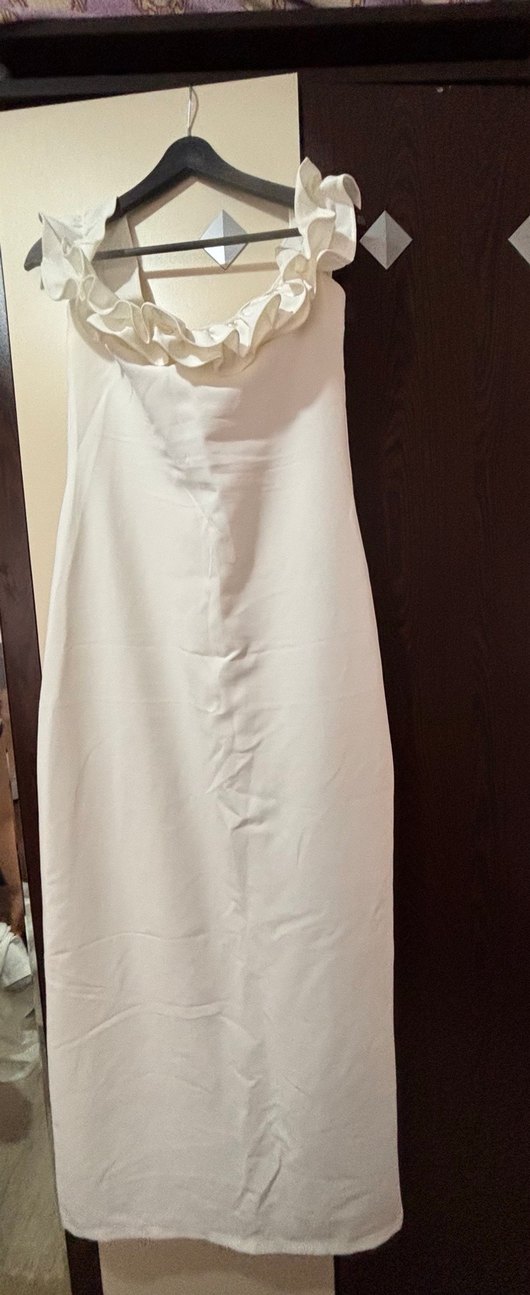 Beyaz straplez gelinlik, düz kesim ve fırfırlı yakaya sahip. Kolsuz ve rahat kalıplı, minimal ve bohem tarz için uygun. Sadece bir kere giyildi iyi durumda nikah için uygun.