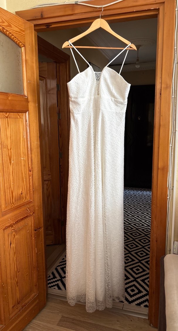 Beyaz straplez, uzun boy, düz kesim gelinliktir. İnce askılar ve bohem tarzıyla klasik ve rahat bir görünüm sunar. Sade tarzıyla nikah söz nişan gibi özel günllerde kullanılabilir.