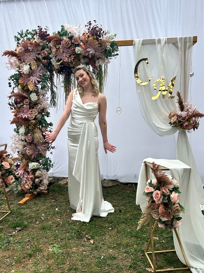 Beyaz straplez, strappy kollu ve bohem tarzda uzun kesim gelinlik, düzenli kalıpta modaya uygun ve avangart bir görünüm sunar.