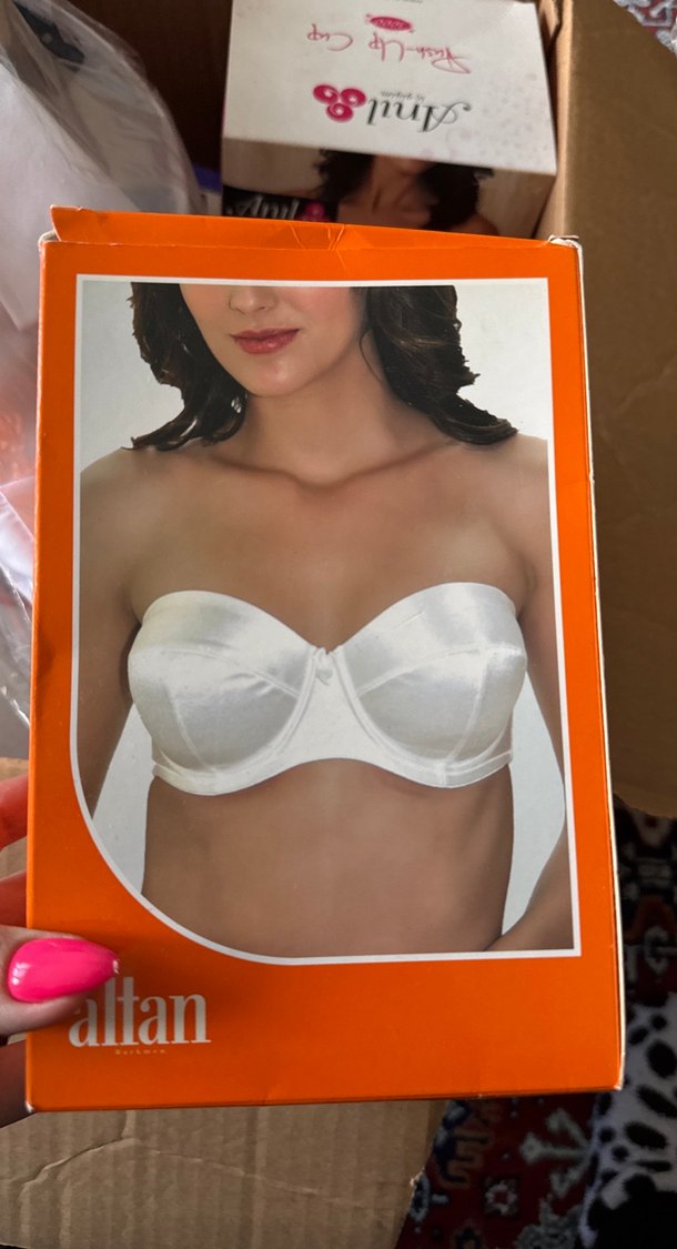 Beyaz straplez, baskılı desenli ve bohem tarzda tasarlanmış bir büstiyerdir. Normal uzunlukta rahat destek sağlar. Üzerinde 'altan' markası bulunur. Sıfırdır. 75 D beden