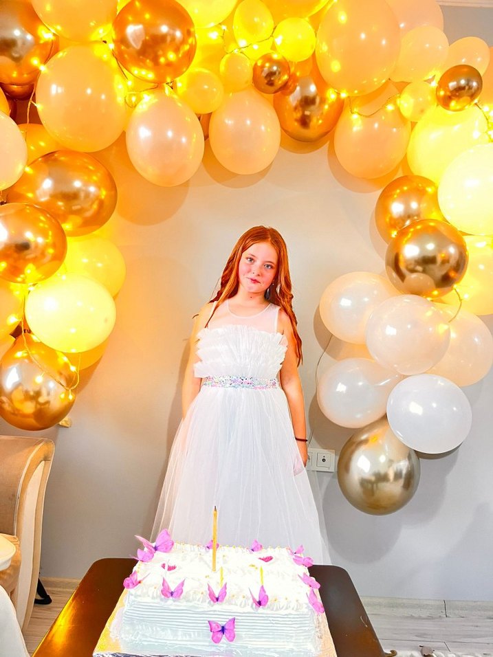 Beyaz straplez, drapeli ve baskılı detaylara sahip, fitted kesim ve kolsuz çocuk abiye elbise. Genç modaseverler için şık ve zarif bir seçim.