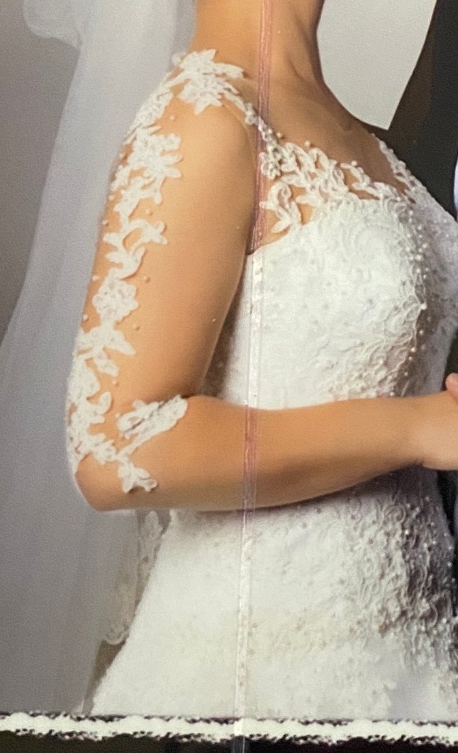 Uzun beyaz A kesim gelinlik, dar kesim ve zarif dantel detaylara sahip. Straplez yaka ve ince askılı kollar klasik Paris tarzını yansıtıyor.