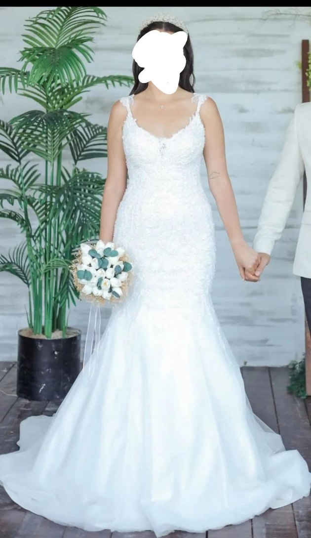 Beyaz straplez, denizkızı kesim gelinlik, ince askılı kollara sahip, modern klasik ve minimalist tarzda şık bir seçimdir.