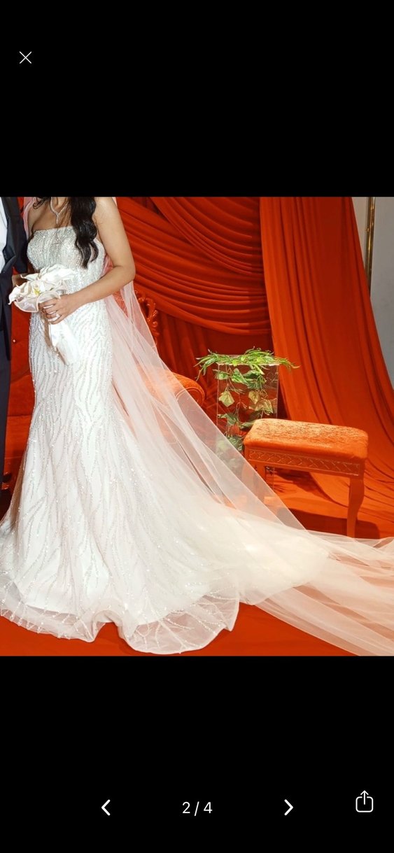 beyaz straplez denizkızı gelinlik, modern klasik tarzı ve gösterişli şıklığı uzun kuyruk ile birleştiriyor. Balık model gelinlik arkası ipli olduğu için ayarlanabilir özel dikim taraklı duvağımı da hediye edeceğim kuru temizlemesi yapıldı sadece bir saat giydim