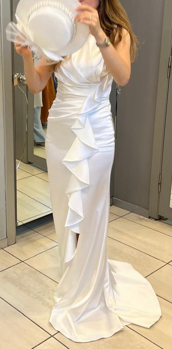 Beyaz, straplez yaka ve sıfır kollu, vücuda oturan denizkızı model gelinlik saten elbise. Ön kısmında şık fırfır detayı bulunur, çağdaş ve göz alıcı bir tasarım. Defosu yok. Hiç giyilmemiş, etiketiyle duruyor. Model kilosu 51 boyu 1.60 boydan kısaltılmadı