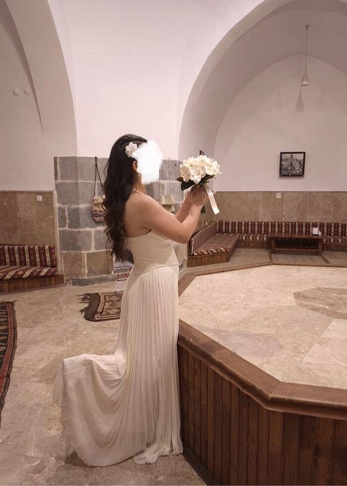 Beyaz straplez drapeli eteği piliseli uzun abiye elbise.Astarlıdır.Sadece bir kere bir kaç saatliğime giyildi hiçbir kusuru sorunu yoktur tertemiz bir elbise.Herkesin çok beğendi çok şık.Markası cercis. 1.65 boy 61 kiloyla giyildi. 8,5 cm topukla giyildi.