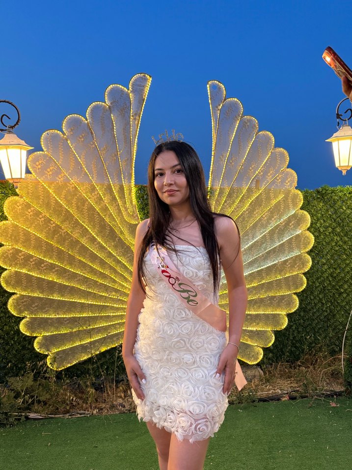 Beyaz straplez, drapeli ve baskılı desenli midi boy, vücuda oturan elbise, gösterişli partiler için uygundur.