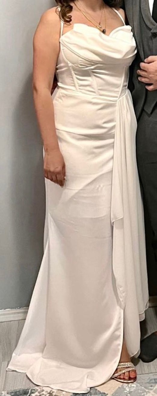 Bu beyaz elbise, straplez yaka ve ince askılarla düz kesim ve vücuda oturan bir siluete sahiptir. Minimalist ve çağdaş tarzda, klasik şıklık sunar.