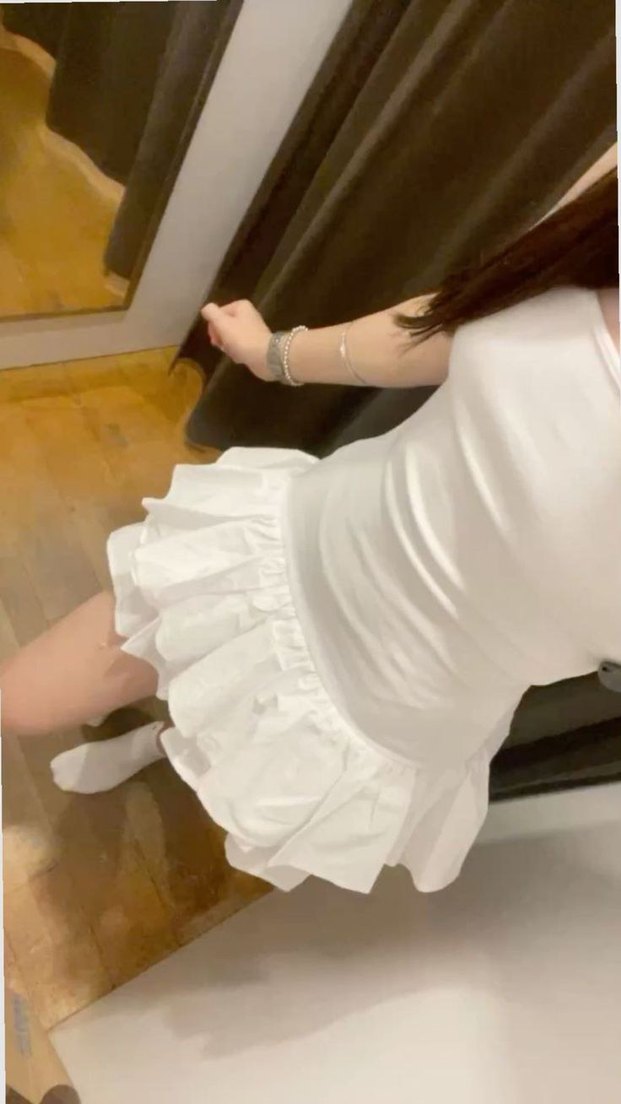 Pamuk kumaştan, straplez yakalı ve askılı kollu, beyaz renkli, vücuda oturan midi elbise. Fırfırlı etek ucu ile parti için uygun, Paris sokak tarzı hissi veriyor.