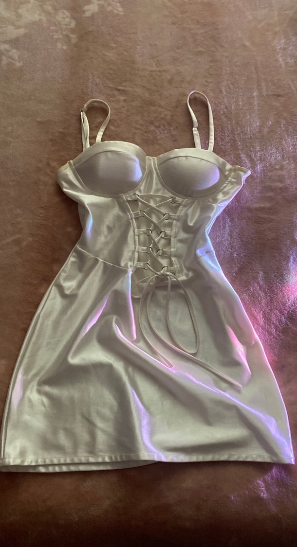 Straplez, düğmeli ve bağcıklı ön detaylı beyaz elbise ürünün tek kusuru fotoğrafta belirtilmiştir ve terzide bir kere üst tarafını daraltmıştım birde sol tarafta fermuar yeri biraz kola batıyor