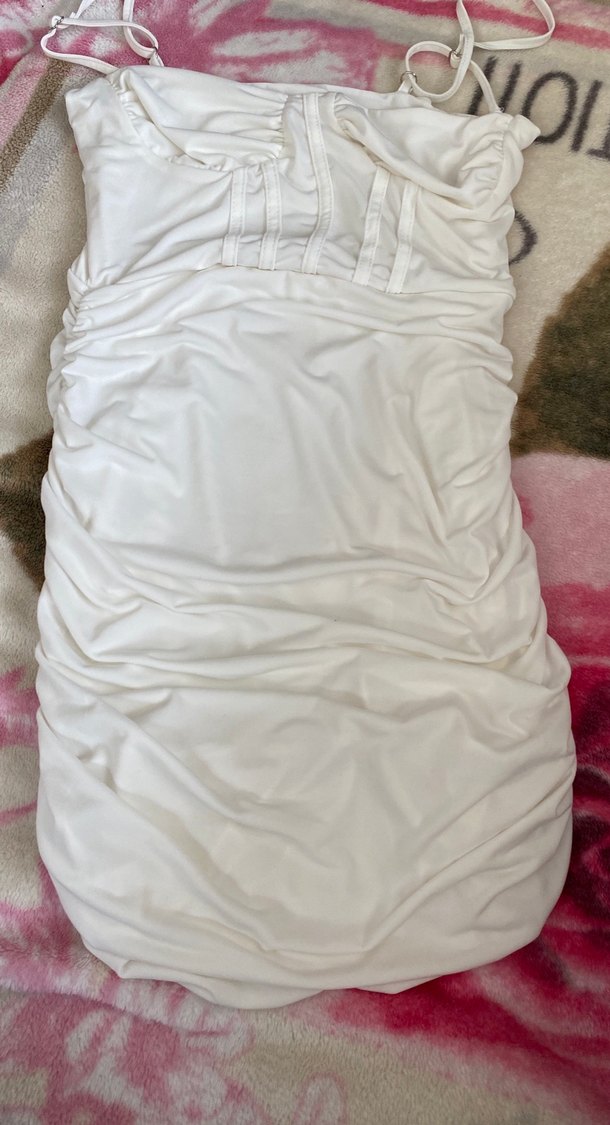 Beyaz straplez, vücuda oturan kesim hamile ve emzirme geceliği, midi boy ve yumuşak kumaştan üretilmiştir. Kolsuz ve desensiz tasarım.