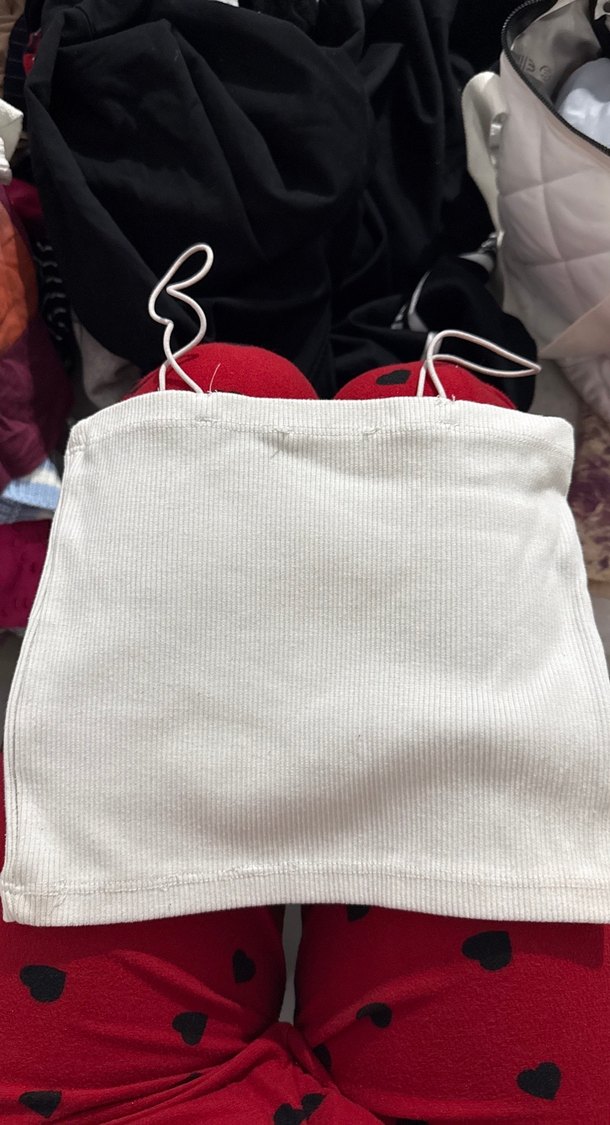 Yumuşak sentetik kumaştan yapılmış, ince askılı ve elastik detaylı beyaz straplez kadın atlet. Günlük sokak giyimi için uygundur.
