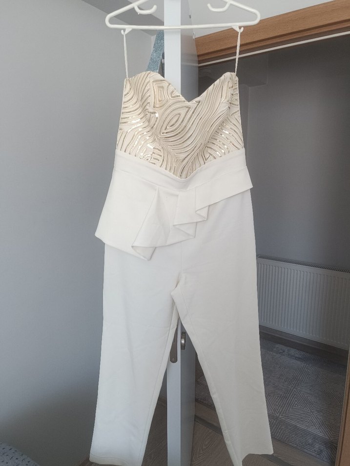 Beyaz straplez kadın tulum, kemerli ve uzun boylu. Kolsuz tasarımı ve sentetik kumaşıyla rahat. Üst kısmı payet detaylı desenli, alt kısmı sade ve şık.