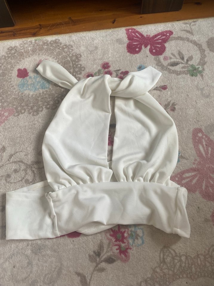 Beyaz straplez yaka, askılı kollu ve fırfırlı detaylı, yumuşak sentetik kumaştan yapılmış, kızlar için dar kesim bolero. Pastel tonlu ve desensiz, sokak stili için uygun.