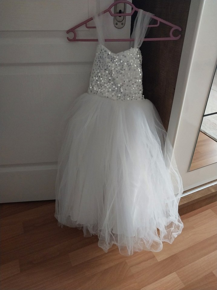 Beyaz straplez, drapeli üst kısmı payetlerle süslü, hafif tül katmanlı etekli kız çocuk abiye elbise. ✨ aski kısmında küçük delik oluştu kısaltıp söktügum için ama giyildiginde görünmüyor.