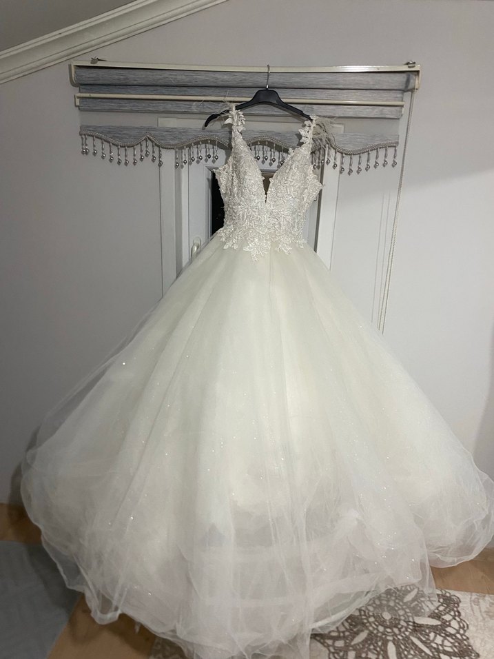Beyaz bohem gelinlik, straplez yaka ve ince askılarla. Dantel işlemeli, fitted A-line kesim ve midi boy ile avant-garde tarzı yansıtıyor. 1 kere giyildi temizlemeye gönderildi yarı fiyatına satıyorum