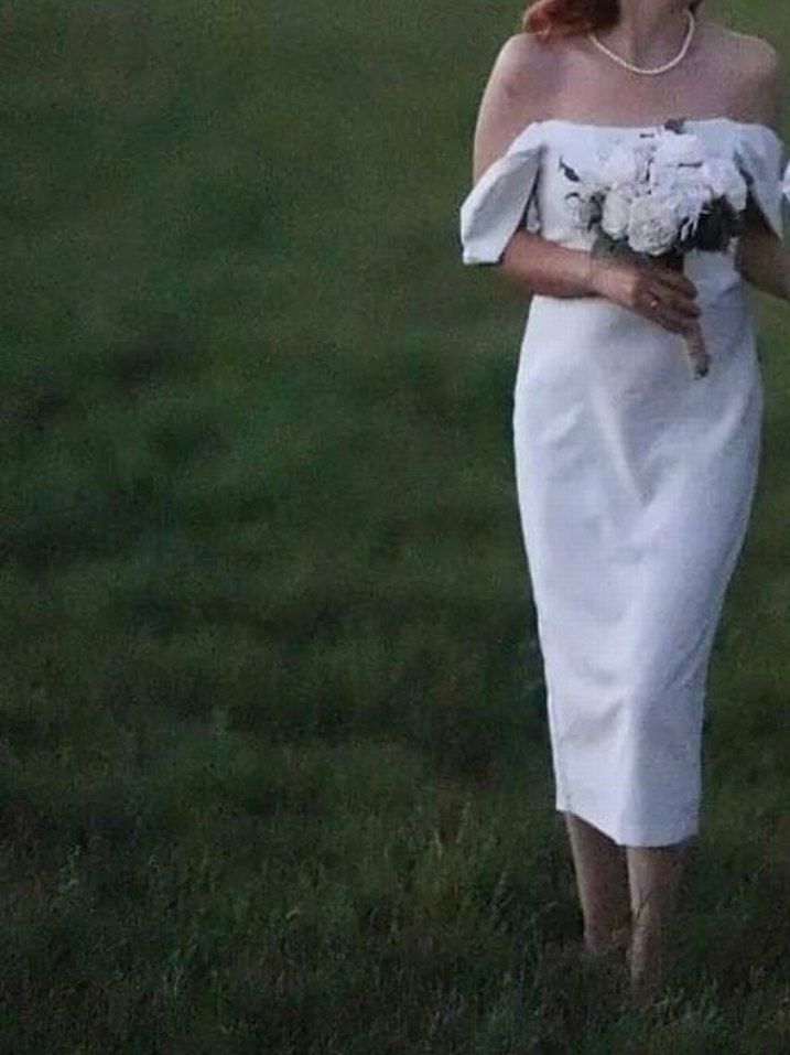Beyaz straplez midi gelinlik, vücuda oturan kesimi ve bohem tarzıyla minimal ve şık bir görünüm sunar. Bir defa giyildi nikahta tertemiz bir sıkıntısı yoktur. Vücudu güzel gösteren zarif elbise