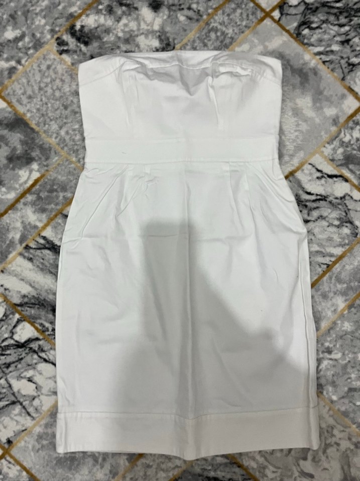 Beyaz renk ve straplez yaka detaylı, vücuda oturan mini elbise. Sentetik kumaştan, minimalist ve dış mekan kullanıma uygun.