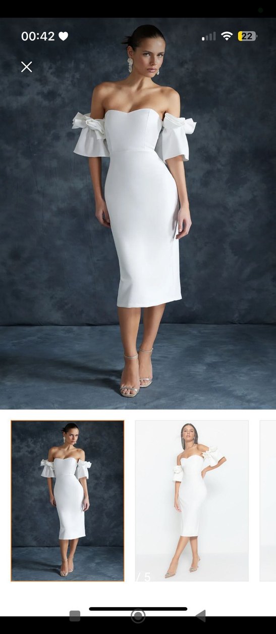 Beyaz straplez midi kalem elbise, ince askılı kollar ve vücuda oturan kesimle şık bir görünüm sunar. Minimalist ve çağdaş tasarımıyla düğünler için uygundur.