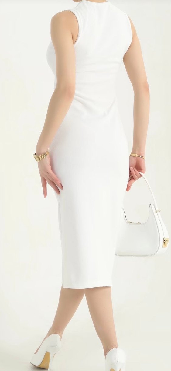 Beyaz straplez midi kalem elbise, hafif ve desensiz, yumuşak sentetik kumaştan, şık ve minimalist tasarıma sahip. Günlük kullanıma uygun, zarif ve modern görünüm sunar.