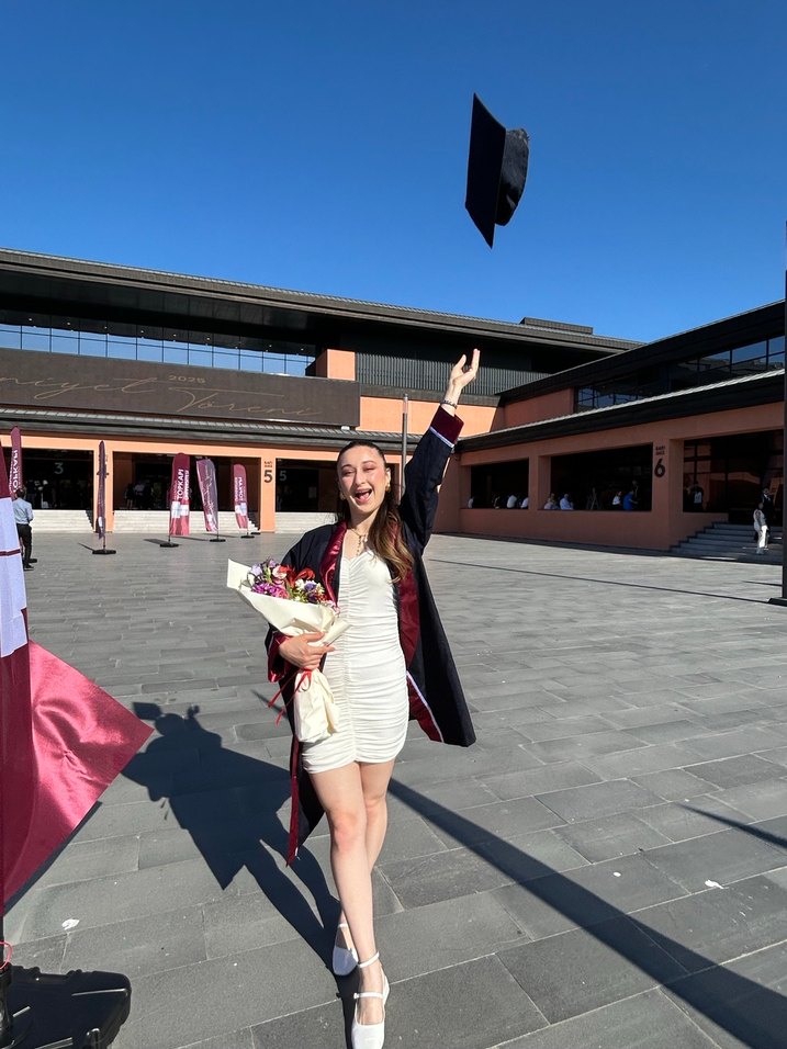 Beyaz, straplez yaka ve uzun kollu, desenli, vücuda oturan midi mezuniyet elbisesi. Püskül detaylarıyla cesur bir sokak tarzı için uygun. Sadece mezuniyetim de giydiğim hiçbir kusuru yoktur
