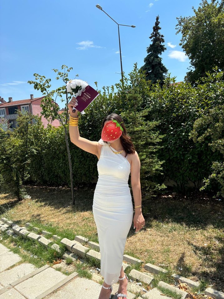 Beyaz Straplez Midi Mezuniyet Elbisesi