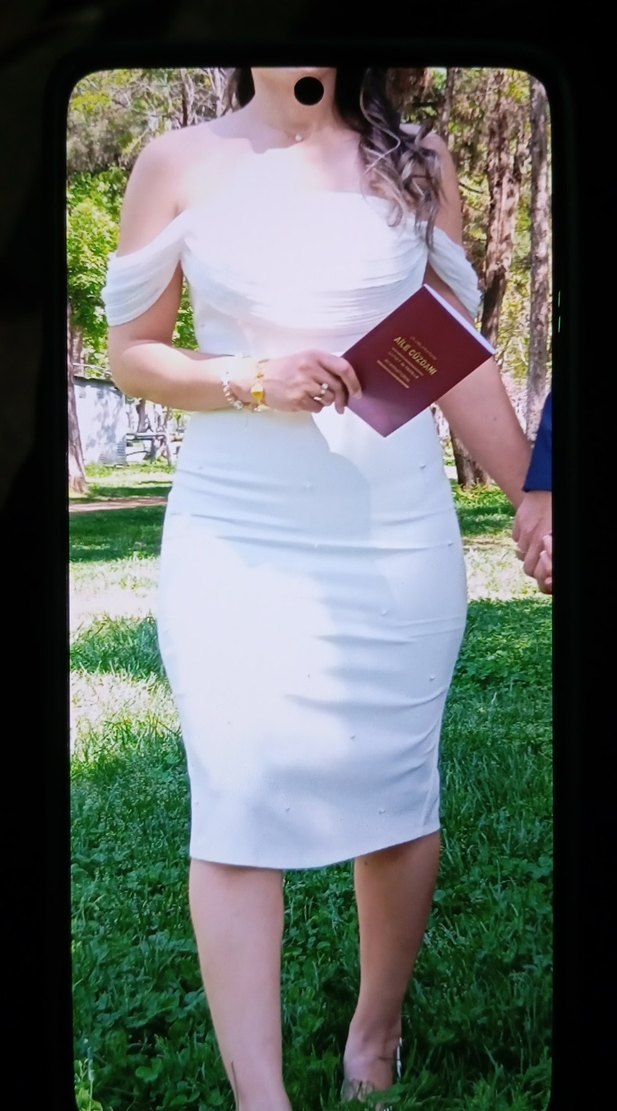 Beyaz midi elbise, straplez yaka, drapeli kısa kollu ve vücuda oturan kesimiyle modern klasik şıklığı yansıtıyor. Mezuniyet ve düğünler için uygun. nikah için alındı sadece bir kere iki saat giyildi temizdir elbise.