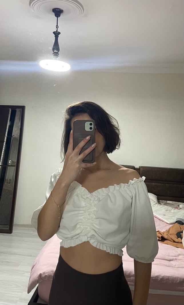 Beyaz straplez, kısa kollu crop bluz