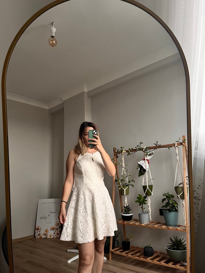 Beyaz straplez mini gelinlik, midi boy ve ince kesim. Minimalist ve bohem tarzı, hafif ve şık görünüm sunar. Sadece nikahda giyilmiştir.