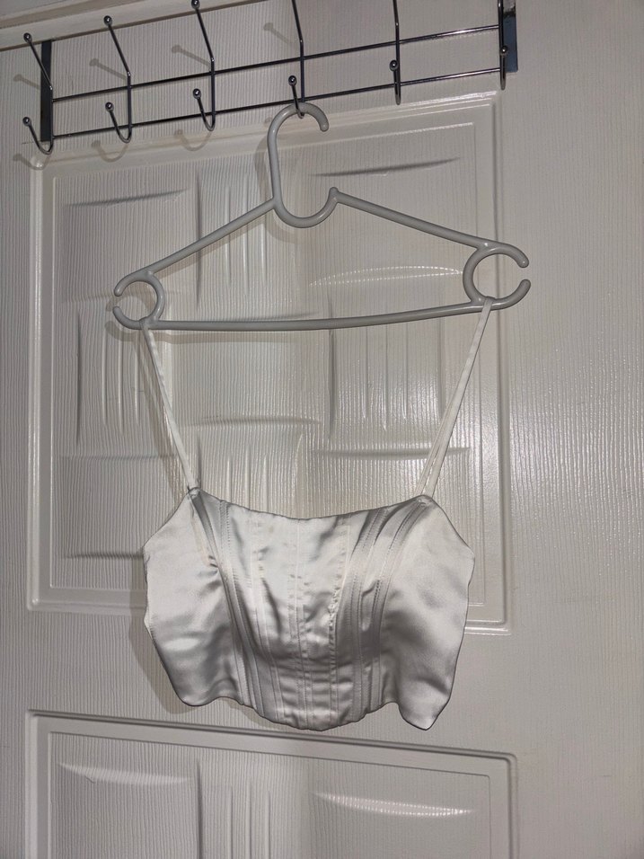 Beyaz straplez, ince askılı ve bel kısmında tokalı detaylı, vücuda oturan mini büstiyer. Pürüzsüz sentetik kumaştan, günlük sokak stiline uygun. ✨