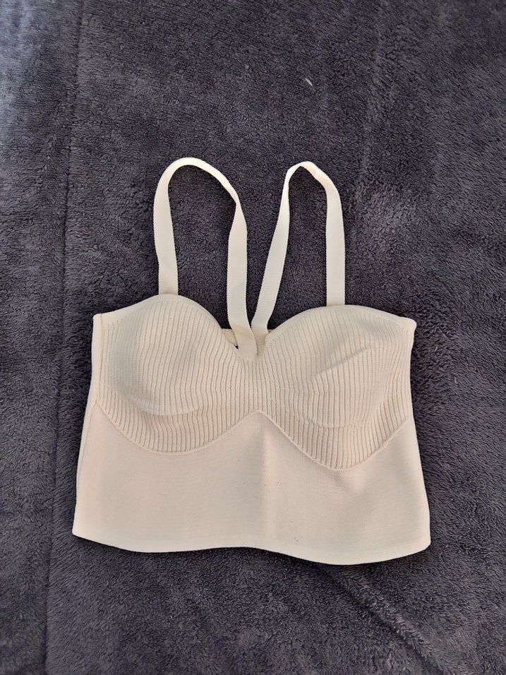 Beyaz, straplez yaka ve ince askılı, yumuşak sentetik kumaştan yapılmış dar kesim bustiyer. Minimalist sokak stili için uygun.