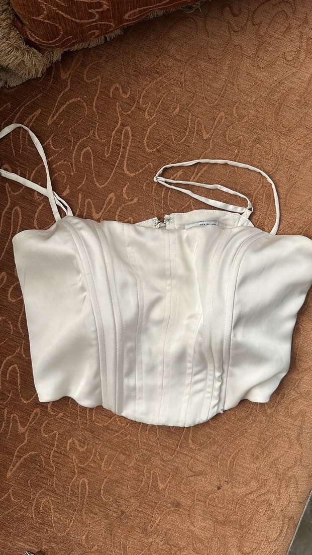 Beyaz, straplez ve askılı kısa mini büstiyer, fermuarlı arkası ve düz yapısıyla günlük sokak modasına uygundur. Hafif ve şık tasarım sunar.