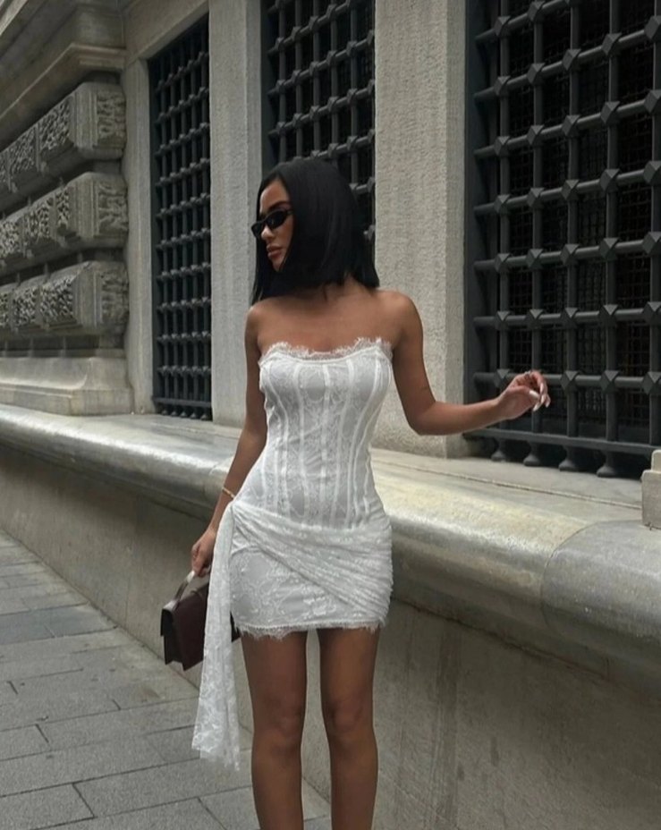 Beyaz, straplez yaka ve ince askılı, vücuda oturan mini elbise. Cesur ve Paris sokak modasına uygun, parti için ideal bir seçim.