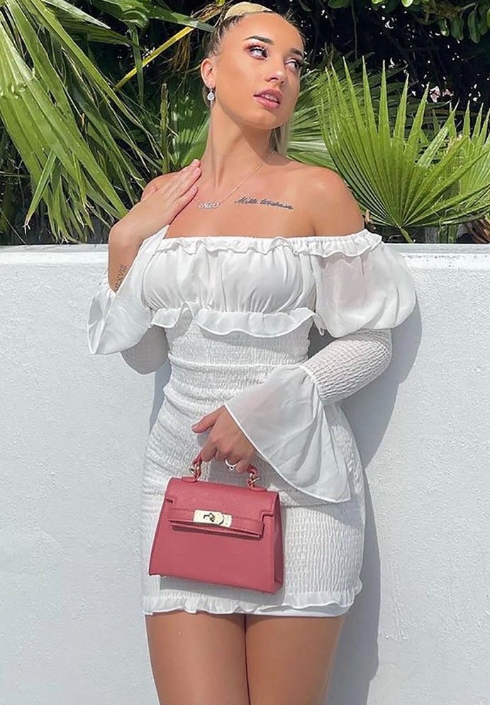Beyaz, straplez, drapeli kolları ve nakış detayları olan, yumuşak sentetik kumaştan yapılmış, vücuda oturan mini elbise. Etiketli yurt dışında aldım