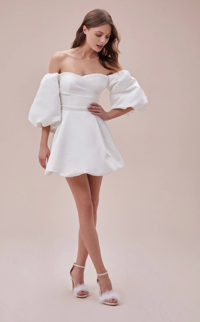 Beyaz, straplez mini elbise, hacimli kollar ve pürüzsüz sentetik kumaştan. Minimalist, çağdaş tarzıyla düğünler için zahmetsiz şıklık sunar. Afterde 3 saat giyildi kuru temizleme yapıldı.