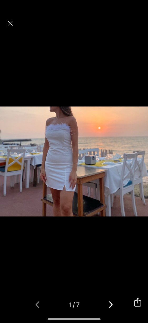 Beyaz, straplez ve kolsuz mini elbise, vücuda oturan kesimi ve ön kısmındaki küçük yırtmaçla dikkat çeker. Pürüzsüz sentetik kumaştan, minimalist ve şık bir parti görünümü sunar. ✨ çok az üst kısımda fotoğrtaki gini tüyerme var