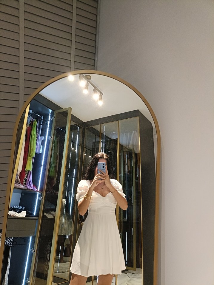 Beyaz straplez mini gelinlik, fit kesim ve ince askılı kollara sahip. Cesur ve minimalist sokak stili için uygun.