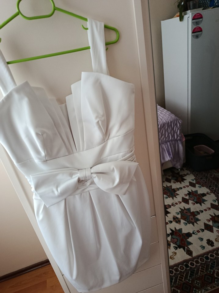 Fitted straplez mini gelinlik, modern klasik tasarım, askılı kollar ve belde fiyonk detayıyla minimalist ve avant-garde tarz için uygun.