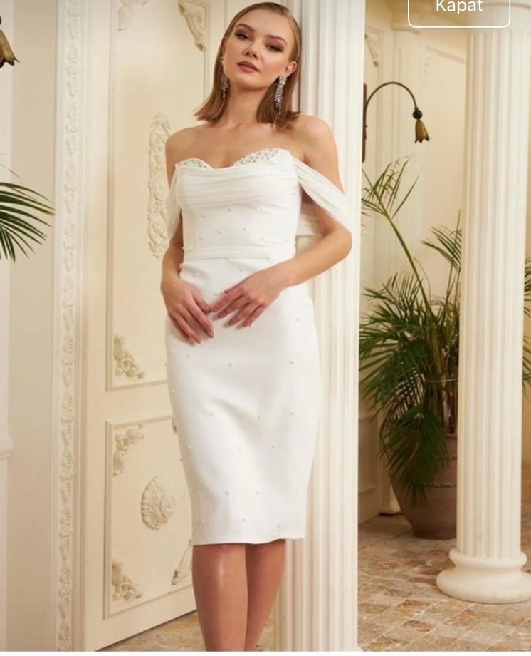 Beyaz straplez, işlemeli ve drapeli detaylara sahip, diz hizasında oturan modern klasik abiye elbise. Düğünler için uygundur. ✨ Sadece 1 kere nikahımda giydim, carmen markadır.
